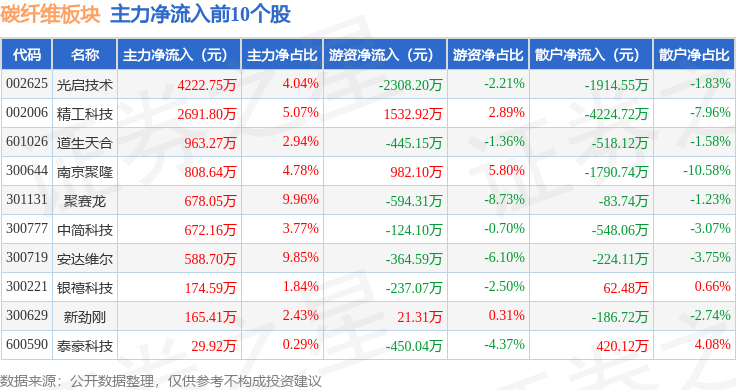 从资金流向上来看,当日碳纤维板块主力资金净流出8.95亿元,游资资金净流入7664.91万元,散户资金净流入8.19亿元。碳纤维板块个股资金流向见下表: