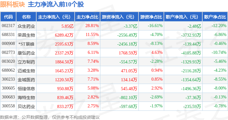从资金流向上来看,当日眼科板块主力资金净流入2.22亿元,游资资金净流出2.01亿元,散户资金净流出2094.57万元。眼科板块个股资金流向见下表: