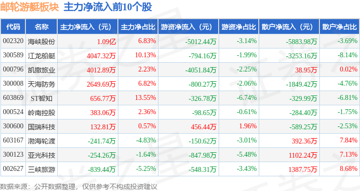 从资金流向上来看,当日邮轮游艇板块主力资金净流出3.38亿元,游资资金净流出1.74亿元,散户资金净流入5.12亿元。邮轮游艇板块个股资金流向见下表: