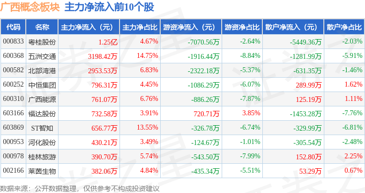 从资金流向上来看,当日广西概念板块主力资金净流出1.11亿元,游资资金净流出1.79亿元,散户资金净流入2.9亿元。广西概念板块个股资金流向见下表: