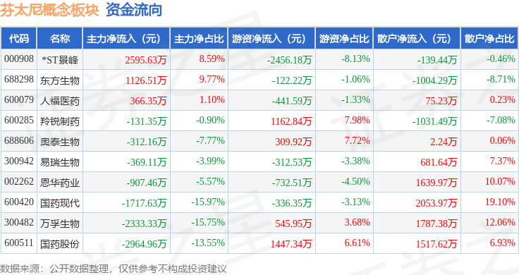 从资金流向上来看,当日芬太尼概念板块主力资金净流出4647.52万元,游资资金净流出935.31万元,散户资金净流入5582.83万元。芬太尼概念板块个股资金流向见下表: