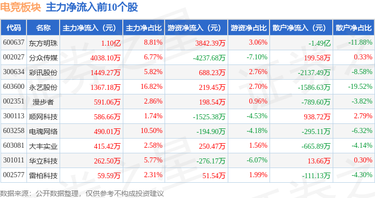从资金流向上来看,当日电竞板块主力资金净流出10.92亿元,游资资金净流入4.37亿元,散户资金净流入6.56亿元。电竞板块个股资金流向见下表:
