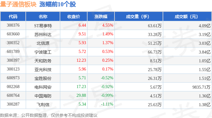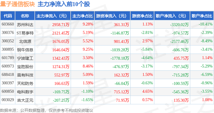 从资金流向上来看,当日量子通信板块主力资金净流出31.47亿元,游资资金净流入10.08亿元,散户资金净流入21.4亿元。量子通信板块个股资金流向见下表: