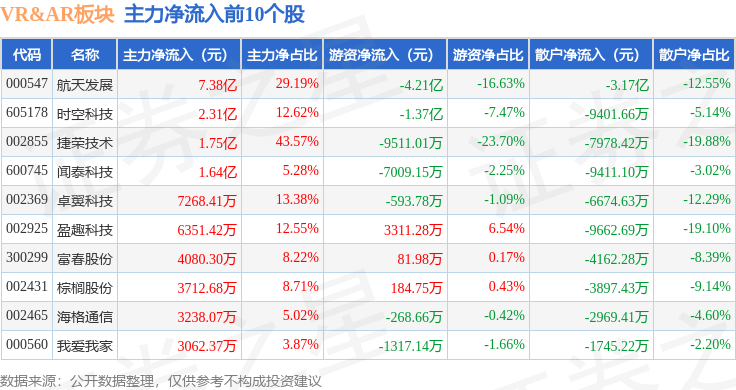 从资金流向上来看,当日VR&AR板块主力资金净流出68.83亿元,游资资金净流入16.88亿元,散户资金净流入51.95亿元。VR&AR板块个股资金流向见下表: