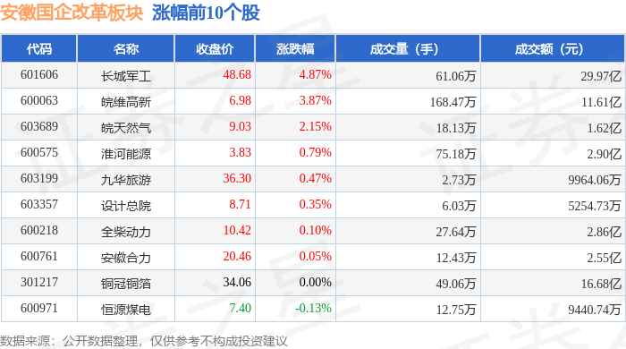 从资金流向上来看,当日安徽国企改革板块主力资金净流出6.32亿元,游资资金净流入4229.94万元,散户资金净流入5.89亿元。安徽国企改革板块个股资金流向见下表: