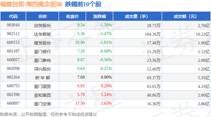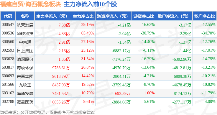 从资金流向上来看,当日福建自贸/海西概念板块主力资金净流入15.69亿元,游资资金净流出10.68亿元,散户资金净流出5.01亿元。福建自贸/海西概念板块个股资金流向见下表:
