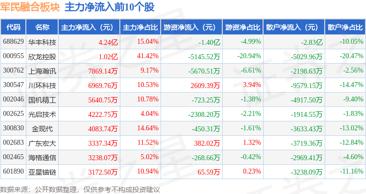 从资金流向上来看,当日军民融合板块主力资金净流出30.22亿元,游资资金净流入2.91亿元,散户资金净流入27.3亿元。军民融合板块个股资金流向见下表: