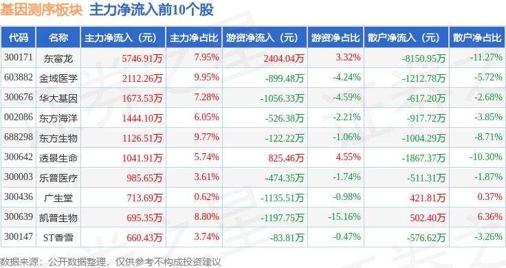 从资金流向上来看,当日基因测序板块主力资金净流出3.14亿元,游资资金净流出3896.09万元,散户资金净流入3.52亿元。基因测序板块个股资金流向见下表: