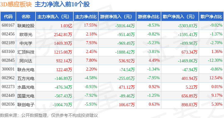 从资金流向上来看,当日3D感应板块主力资金净流出9.54亿元,游资资金净流入1945.13万元,散户资金净流入9.35亿元。3D感应板块个股资金流向见下表: