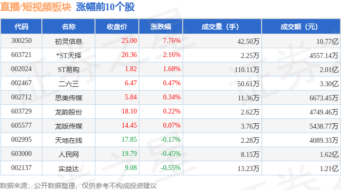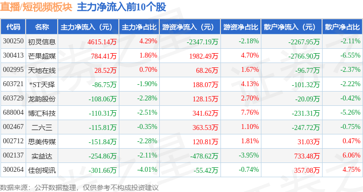 从资金流向上来看,当日直播/短视频板块主力资金净流出14.39亿元,游资资金净流入5.73亿元,散户资金净流入8.66亿元。直播/短视频板块个股资金流向见下表: