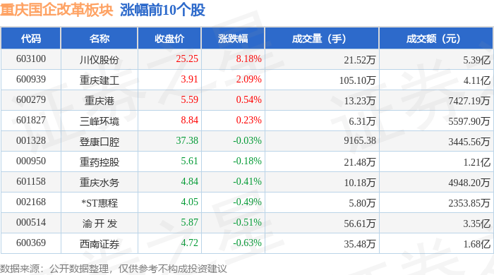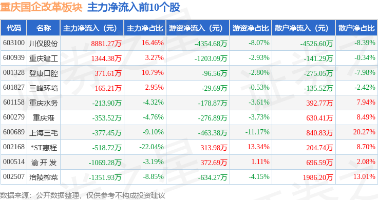 从资金流向上来看,当日重庆国企改革板块主力资金净流出1166.82万元,游资资金净流出4922.93万元,散户资金净流入6089.75万元。重庆国企改革板块个股资金流向见下表: