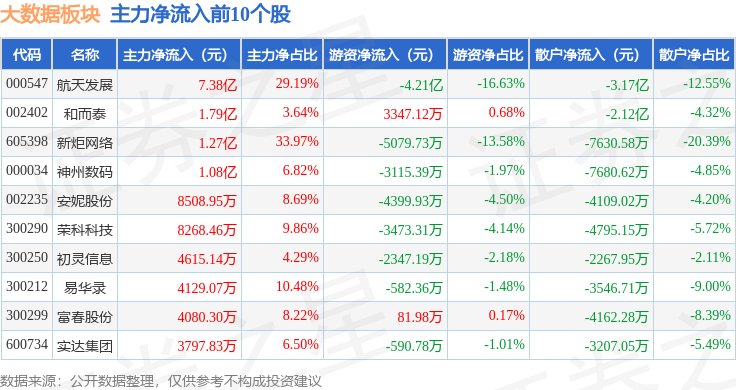 从资金流向上来看,当日大数据板块主力资金净流出87.51亿元,游资资金净流入24.21亿元,散户资金净流入63.3亿元。大数据板块个股资金流向见下表:
