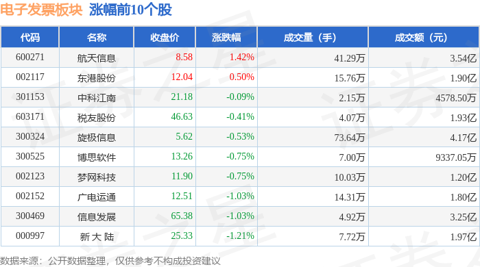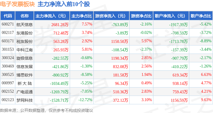 从资金流向上来看,当日电子发票板块主力资金净流出4.52亿元,游资资金净流入9161.82万元,散户资金净流入3.6亿元。电子发票板块个股资金流向见下表: