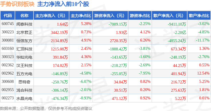 从资金流向上来看,当日手势识别板块主力资金净流出1.32亿元,游资资金净流入1.47亿元,散户资金净流出1489.97万元。手势识别板块个股资金流向见下表: