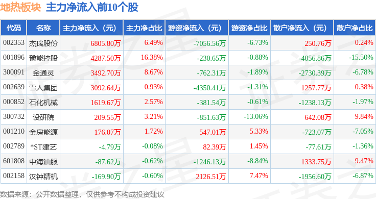 从资金流向上来看,当日地热板块主力资金净流出7819.44万元,游资资金净流出1.33亿元,散户资金净流入2.12亿元。地热板块个股资金流向见下表: