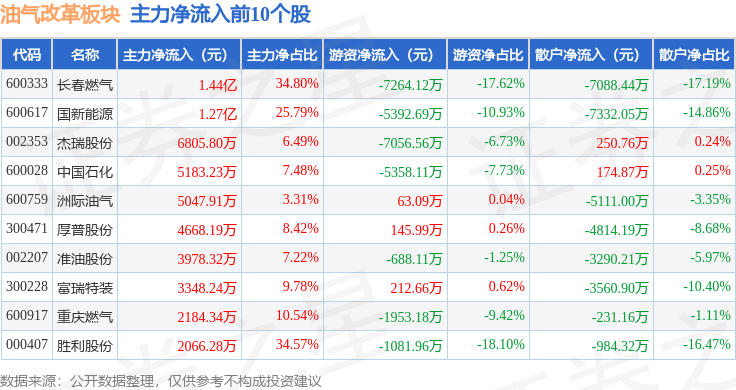 从资金流向上来看,当日油气改革板块主力资金净流出5430.82万元,游资资金净流出2.63亿元,散户资金净流入3.17亿元。油气改革板块个股资金流向见下表: