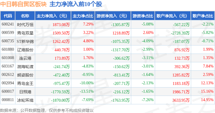 从资金流向上来看,当日中日韩自贸区板块主力资金净流出4.81亿元,游资资金净流入1.62亿元,散户资金净流入3.19亿元。中日韩自贸区板块个股资金流向见下表: