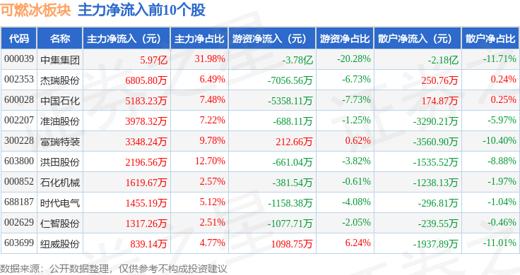 从资金流向上来看,当日可燃冰板块主力资金净流入2.08亿元,游资资金净流出5.41亿元,散户资金净流入3.33亿元。可燃冰板块个股资金流向见下表: