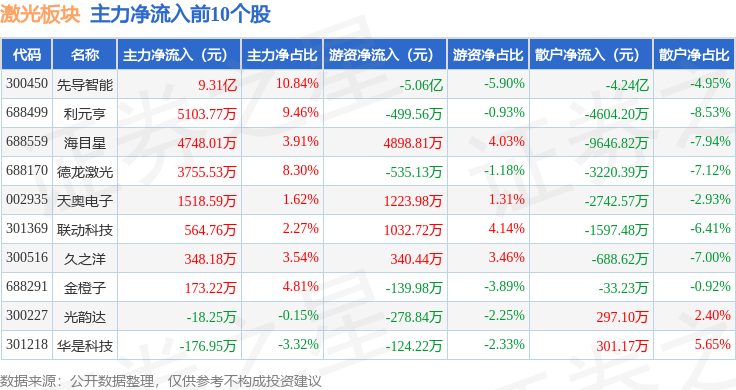 从资金流向上来看,当日激光板块主力资金净流出3.02亿元,游资资金净流出2.44亿元,散户资金净流入5.46亿元。激光板块个股资金流向见下表: