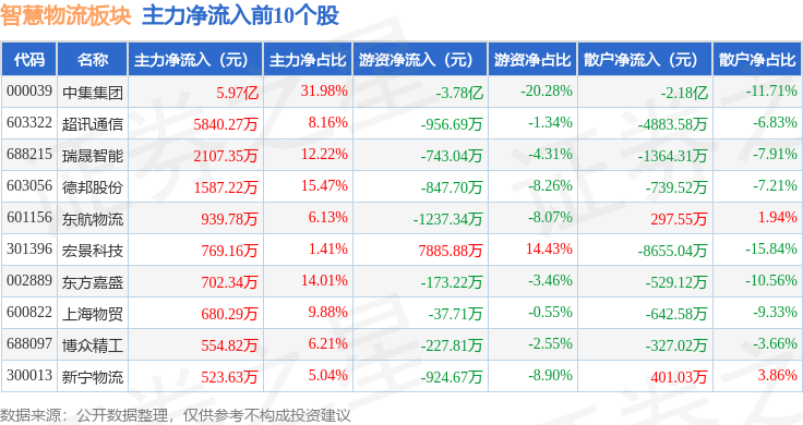 从资金流向上来看,当日智慧物流板块主力资金净流出15.72亿元,游资资金净流出8572.4万元,散户资金净流入16.58亿元。智慧物流板块个股资金流向见下表: