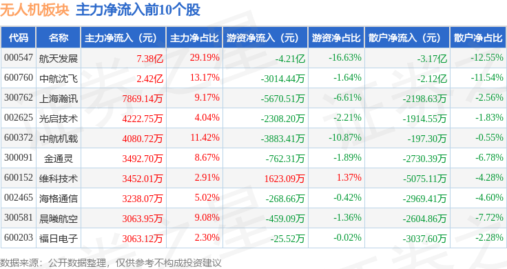 从资金流向上来看,当日无人机板块主力资金净流出12.25亿元,游资资金净流出3.91亿元,散户资金净流入16.16亿元。无人机板块个股资金流向见下表: