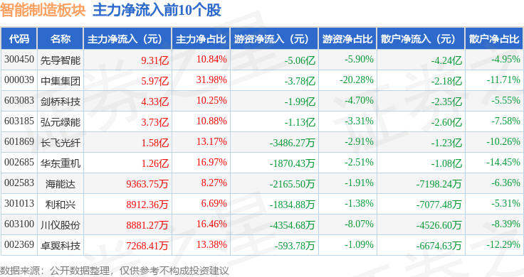 从资金流向上来看,当日智能制造板块主力资金净流出115.21亿元,游资资金净流入11.57亿元,散户资金净流入103.64亿元。智能制造板块个股资金流向见下表: