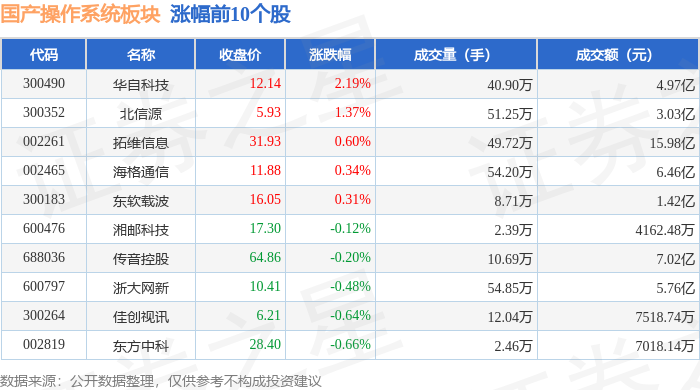 证券之星消息,11月14日国产操作系统板块较上一交易日下跌2.05%,同有科技领跌。当日上证指数报收于3990.49,下跌0.97%。深证成指报收于13216.03,下跌1.93%。国产操作系统板块个股涨跌见下表: