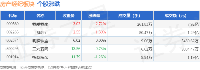 证券之星消息,11月14日房产经纪板块较上一交易日上涨0.28%,我爱我家领涨。当日上证指数报收于3990.49,下跌0.97%。深证成指报收于13216.03,下跌1.93%。房产经纪板块个股涨跌见下表: