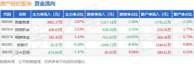 从资金流向上来看,当日房产经纪板块主力资金净流入2954.71万元,游资资金净流出3523.63万元,散户资金净流入568.92万元。房产经纪板块个股资金流向见下表: