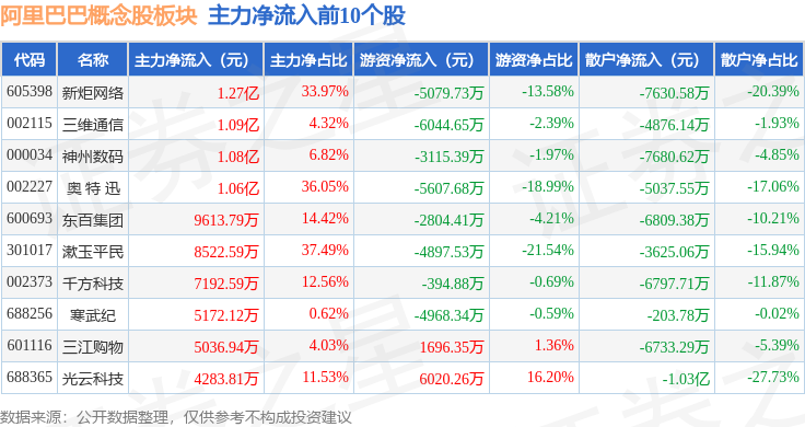 从资金流向上来看,当日阿里巴巴概念股板块主力资金净流出71.25亿元,游资资金净流入21.88亿元,散户资金净流入49.37亿元。阿里巴巴概念股板块个股资金流向见下表: