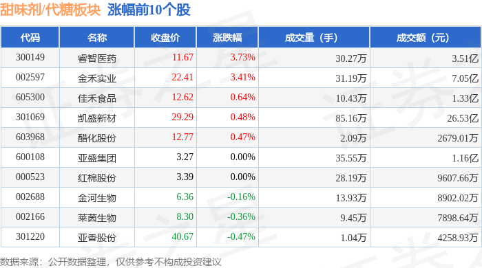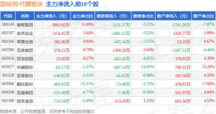 从资金流向上来看,当日甜味剂/代糖板块主力资金净流出4.05亿元,游资资金净流出573.26万元,散户资金净流入4.1亿元。甜味剂/代糖板块个股资金流向见下表: