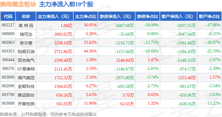 从资金流向上来看,当日换电概念板块主力资金净流出8.96亿元,游资资金净流入7197.14万元,散户资金净流入8.24亿元。换电概念板块个股资金流向见下表: