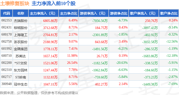 从资金流向上来看,当日土壤修复板块主力资金净流出5.16亿元,游资资金净流出1.27亿元,散户资金净流入6.43亿元。土壤修复板块个股资金流向见下表: