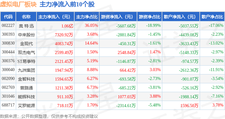 从资金流向上来看,当日虚拟电厂板块主力资金净流出34.25亿元,游资资金净流入4.83亿元,散户资金净流入29.41亿元。虚拟电厂板块个股资金流向见下表: