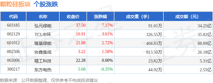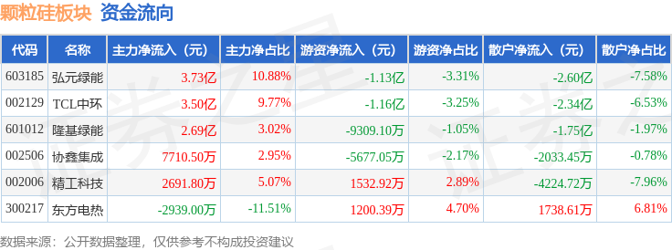 从资金流向上来看,当日颗粒硅板块主力资金净流入10.66亿元,游资资金净流出3.52亿元,散户资金净流出7.14亿元。颗粒硅板块个股资金流向见下表: