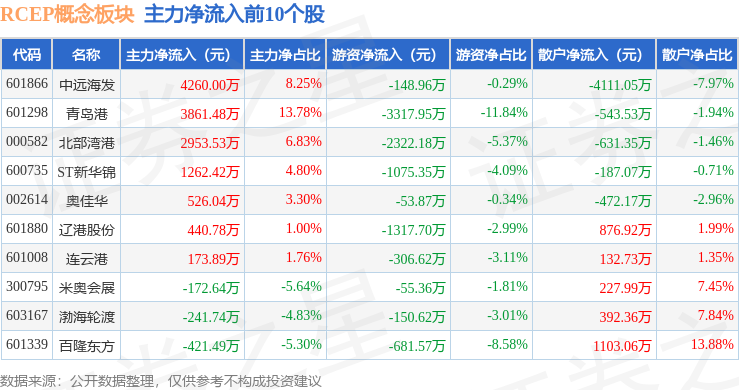 从资金流向上来看,当日RCEP概念板块主力资金净流出7328.01万元,游资资金净流出6909.1万元,散户资金净流入1.42亿元。RCEP概念板块个股资金流向见下表: