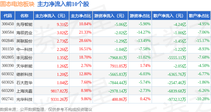 从资金流向上来看,当日固态电池板块主力资金净流出78.82亿元,游资资金净流入25.26亿元,散户资金净流入53.56亿元。固态电池板块个股资金流向见下表: