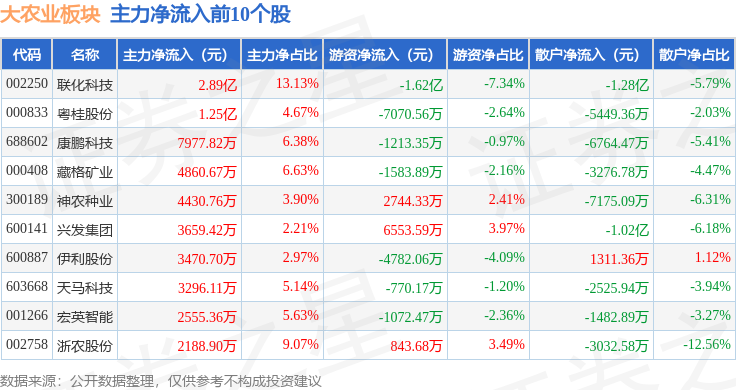 从资金流向上来看,当日大农业板块主力资金净流出26.08亿元,游资资金净流入6.32亿元,散户资金净流入19.76亿元。大农业板块个股资金流向见下表: