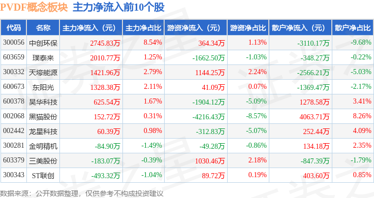 从资金流向上来看,当日PVDF概念板块主力资金净流出10.26亿元,游资资金净流入2.12亿元,散户资金净流入8.14亿元。PVDF概念板块个股资金流向见下表: