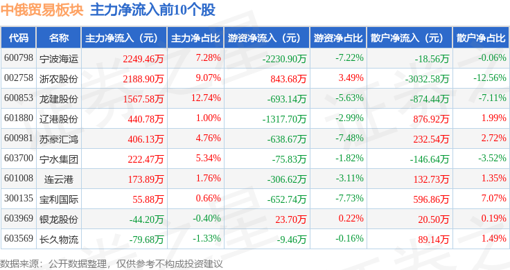 从资金流向上来看,当日中俄贸易板块主力资金净流出4772.53万元,游资资金净流出6656.16万元,散户资金净流入1.14亿元。中俄贸易板块个股资金流向见下表: