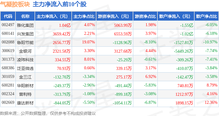 从资金流向上来看,当日气凝胶板块主力资金净流出2.66亿元,游资资金净流入2.26亿元,散户资金净流入3981.93万元。气凝胶板块个股资金流向见下表: