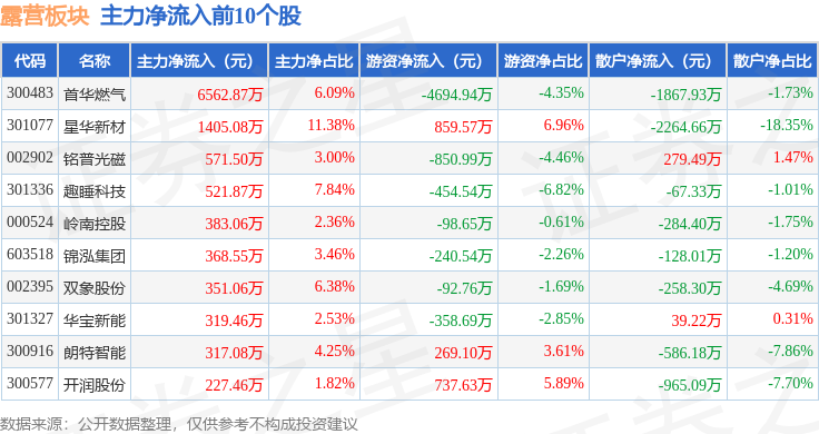 从资金流向上来看,当日露营板块主力资金净流出2.6亿元,游资资金净流出3557.95万元,散户资金净流入2.95亿元。露营板块个股资金流向见下表: