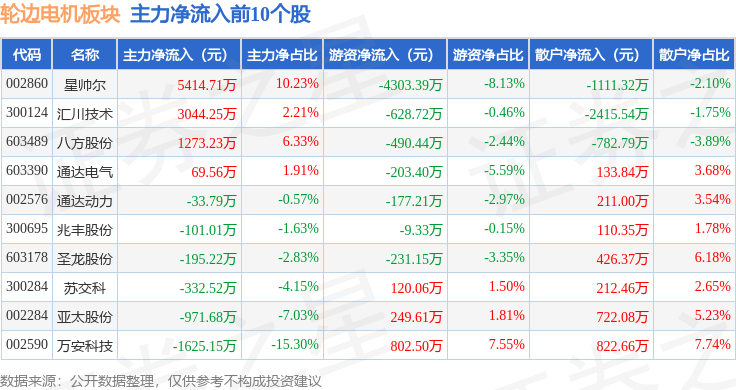 从资金流向上来看,当日轮边电机板块主力资金净流出7.62亿元,游资资金净流出293.93万元,散户资金净流入7.65亿元。轮边电机板块个股资金流向见下表: