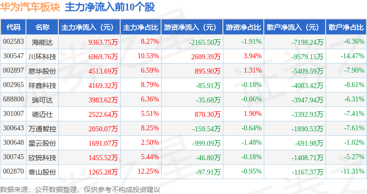 从资金流向上来看,当日华为汽车板块主力资金净流出29.94亿元,游资资金净流入7.61亿元,散户资金净流入22.32亿元。华为汽车板块个股资金流向见下表: