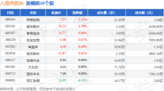 证券之星消息,11月14日人造肉板块较上一交易日下跌0.75%,海欣食品领跌。当日上证指数报收于3990.49,下跌0.97%。深证成指报收于13216.03,下跌1.93%。人造肉板块个股涨跌见下表: