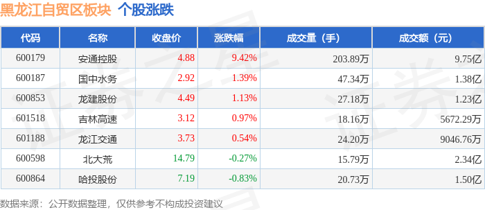 证券之星消息,11月14日黑龙江自贸区板块较上一交易日上涨2.03%,安通控股领涨。当日上证指数报收于3990.49,下跌0.97%。深证成指报收于13216.03,下跌1.93%。黑龙江自贸区板块个股涨跌见下表:
