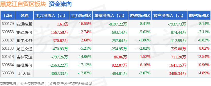 从资金流向上来看,当日黑龙江自贸区板块主力资金净流入1.12亿元,游资资金净流出8878.83万元,散户资金净流出2360.59万元。黑龙江自贸区板块个股资金流向见下表: