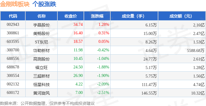 证券之星消息,11月14日金刚线板块较上一交易日下跌1.05%,黄河旋风领跌。当日上证指数报收于3990.49,下跌0.97%。深证成指报收于13216.03,下跌1.93%。金刚线板块个股涨跌见下表: