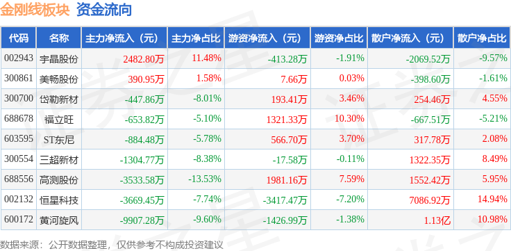 从资金流向上来看,当日金刚线板块主力资金净流出1.75亿元,游资资金净流出1205.08万元,散户资金净流入1.87亿元。金刚线板块个股资金流向见下表: