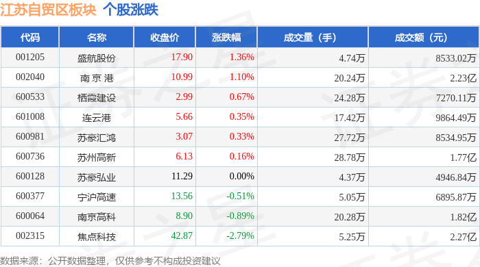 证券之星消息,11月14日江苏自贸区板块较上一交易日下跌0.43%,焦点科技领跌。当日上证指数报收于3990.49,下跌0.97%。深证成指报收于13216.03,下跌1.93%。江苏自贸区板块个股涨跌见下表: